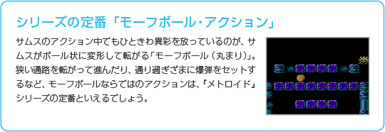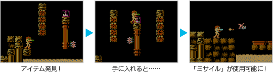 各所に配置されている「パワーアップアイテム」を手に入れるとサムスの能力がアップしたり、新たなアクションが使用可能になります。キャラクターがさまざまにパワーアップする楽しさを味わってください。 ![]() |