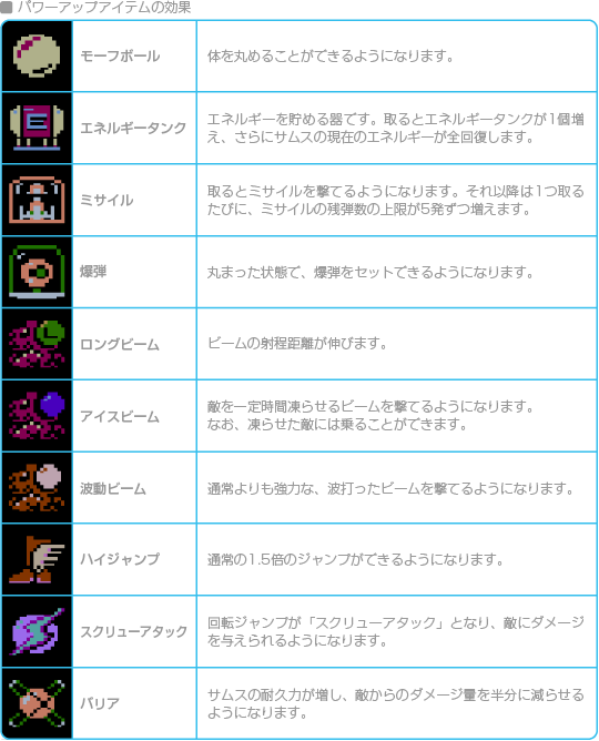 10種類のパワーアップアイテムを取ると、サムスのアクションが増えたり、能力が上昇します。