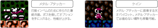サイドビュー画面では、超惑星間万能車両メタル・アタッカーと、パイロットのケインを切り替えて操作することができます。それぞれ特徴が異なり、場面によって使い分けることで先に進むことができます。 ![]() |