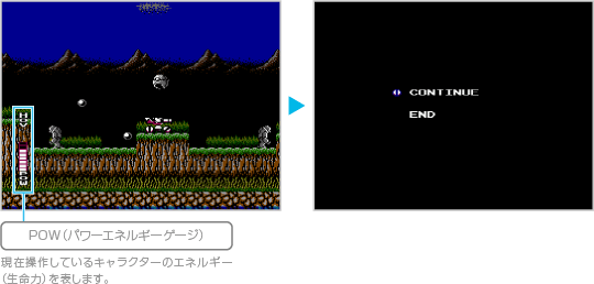 敵からの攻撃やダメージを受けるとパワーエネルギーゲージが減り、なくなるとミスになって1機失います。3機失うとゲームオーバーです。ゲームオーバー時に「CONTINUE」を選んで