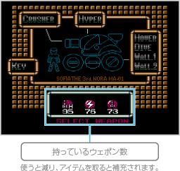 エリアで特定のアイテムを取るとウェポンが使えるようになります。アイテムを使うときは、サブ画面で