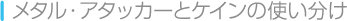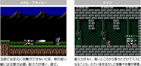 サイドビュー画面では、メタル・アタッカーとケインの両方を操作できます。それぞれ耐久力や攻撃方法などに違いがあるので、場面に応じて使い分けてください。 ![]() |