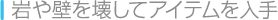 | 岩や壁の中にもアイテムが隠されています。辺りが岩や壁などに囲まれていたら、壊してみてください。たくさんのアイテムが手に入るかもしれません。 | ![]() |