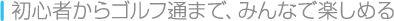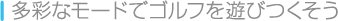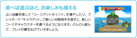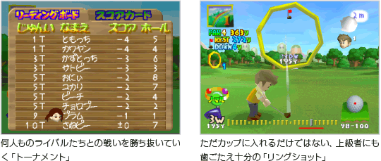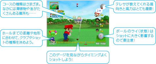 ゲームのルールはとてもカンタン。ゴルフについてまったく知らなくても、ショット画面でゲージを見ながらタイミングよくボタンを押すだけで、ナイスショットを打つことができます。 また、ショット前にクラブの種類や打点など、細かい設定ができるのも特徴。操作に慣れた人やゴルフ好きの人は、ショット画面の情報をよく見ながら設定を行って、好成績をめざしてみましょう。 ![]() |