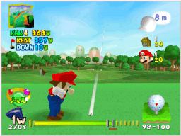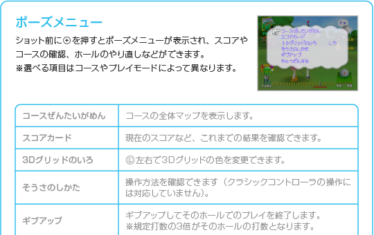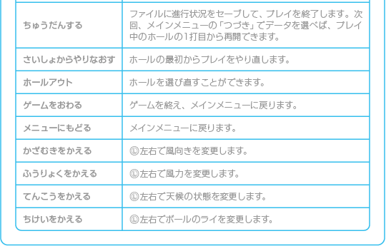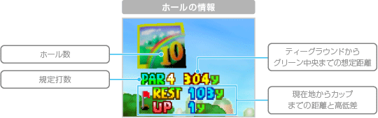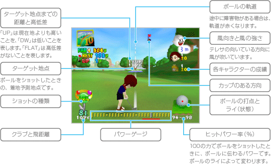 ホール内にあるカップをめざして、ボールをショットしましょう。最初は1Pからショットを始め、以降はカップまでの距離が長いプレイヤーから順番にショットします。 自分の番が来たら、まずショットの設定を決め、続いてボールをショットしてください。グリーンにボールが乗るとパッティングを行い、カップにボールを入れると次のホールに進みます。 |