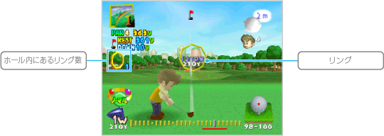 ホール内にセットされたリングにボールを通し、そのホールを規定打数以内でクリアしましょう。ホールをクリアするとスターが手に入り、一定数のスターを集めると、次のコースで遊べるようになります。 |