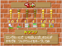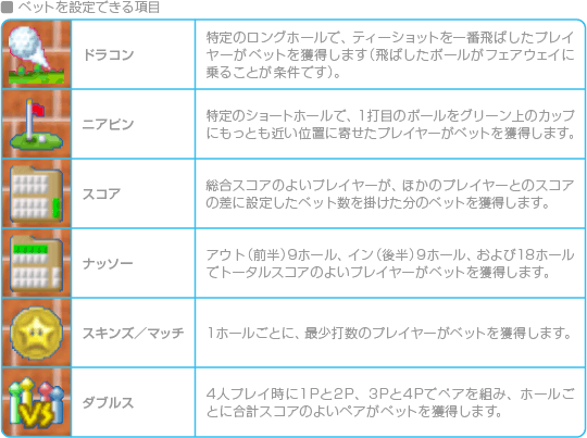 ベットとは賭け点のことです。 ベットを設定すると各ホールで成績のよいプレイヤーに、そのほかのプレイヤーがベットを支払います。たとえば4人で対戦時に「ドラコン」のベットを「1」に設定した場合、ティーショットを一番飛ばしたプレイヤーはほかのプレイヤーから1点ずつもらい、合計3点のベットを獲得します。 ※設定項目はプレイモードによって異なります。