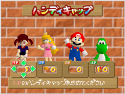 ベットの設定を終えると、ハンディキャップを設定できます。 ハンディキャップを設定していると、総合スコアがその数値に応じて一定量マイナスされます。たとえば、ハンディキャップを36に設定して全18ホールをプレイすると、各ホールに−2打のハンデがつきます。なお、ハンディキャップが適用されるホールには、スコアカードのスコア欄に「−」が表示されます(−2打のホールでは、「−」が2つ付きます)。 ※ハンディキャップが適用されるホールは、コンピュータが自動的に設定します。