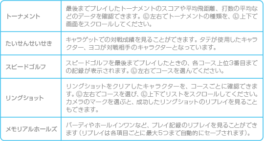 メインメニューで選べる「クラブハウス」では、成績の確認やゲーム設定の変更、遊びかたの確認ができます。