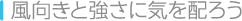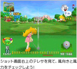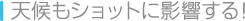 コース内に吹いている風は、ボールが飛ぶ方向や距離に大きく影響します。たとえば向かい風のときはいつもよりも強めにショットしたり、左に向かって風が吹いているときは、やや右寄りにショットするなど、風に合わせてショットを調整しましょう。 |
