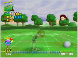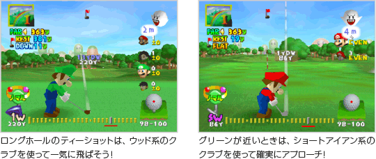 ショットの飛距離は、使うクラブの種類によって大きく変わります。ウッド系(1W〜4W)はもっとも飛距離が長く、続いてロングアイアン(2I〜6I)、ショートアイアン(7I〜9I、PW、SW)の順に飛距離が短くなっていきます。 クラブの特徴を覚え、カップまでの距離や状況によってうまく使い分けることが、少ない打数で効率よくホールをクリアするカギとなります。 ![]() |