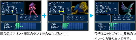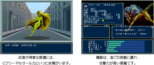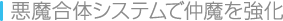 仲魔にした悪魔を2体合体させると、新たな仲魔を作り出すことができます。組み合わせによっては、強力な仲魔が作り出されることも。なかでも、天使や鬼神といった仲魔専用の種族は、攻撃や回復に役立つ「特技」を覚えることができます。 ![]() |
