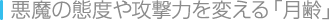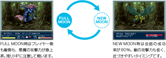 戦闘中は、プレイヤーと敵の行動(ターン)が終わるごとに月齢(月の満ち欠け)が変化します。月齢がFULL MOON(満月)に近いときは、悪魔の攻撃力が上昇し、会話がしにくくなります。NEW MOON(新月)に近いときは、悪魔の攻撃力が減少し、会話をしやすくなります。 ![]() |