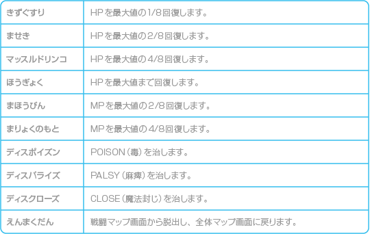 一度使うと、なくなってしまうアイテムです。おもに敵を倒すか、宝箱を取ると手に入ります。