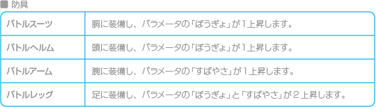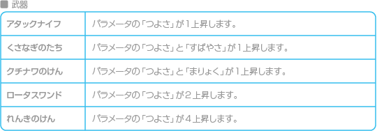 ヒーローとヒロインが装備できるアイテムです。敵を倒すか、宝箱を取るか、ラグの店で手に入れることができます。ここでは一部のアイテムを紹介します。