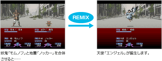 仲魔にしたアクマを合体させることで、新しいアクマを作り出すことができます。これを「REMIXシステム」といい、2体の仲魔を組み合わせる方法と、3体の仲魔を組み合わせてより強い特殊な仲魔を作る方法があります。また、合体で予想外の仲魔が現れる場合もあり、いろいろな組み合わせを試すことで多くの仲魔を獲得できます。 ![]() |