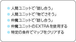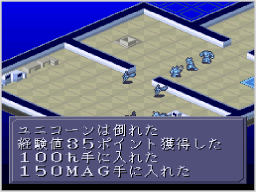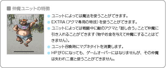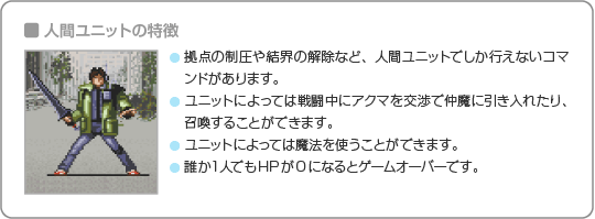 プレイヤーは味方の人間ユニット(ナオキなどの仲間を表す駒)と仲魔にしたアクマユニットを操作してゲームを進めていきます。人間ユニットと仲魔ユニットには以下のような特徴があります。 ![]() ![]() |