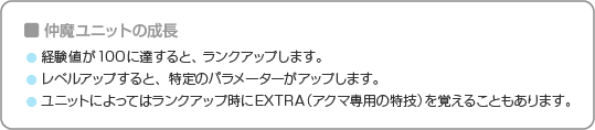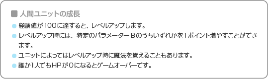 ユニットは戦闘マップで敵を倒して経験値を得ると成長します。 成長の内容は、人間ユニットと仲魔ユニットで異なります。 ![]() ![]() |