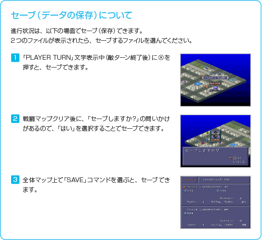 人間ユニットのHPが1人でも0になるとゲームオーバーとなり、データのロード画面に戻ります。 マップによっては、拠点を敵に奪われるなど特定の条件で、ゲームオーバーになる場合もあります。 セーブしている場合は、最後にセーブした場所からプレイし直すことができます。 |