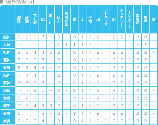 移動コストは各種族ごとに異なり、種族によっては入れない地形もあります。