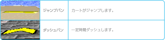 コース上には以下のような仕掛けがあり、カートで踏むとさまざまな影響があります。 ![]() |