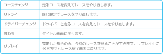 コースを5周するとゴールになり、レースが終了します。 レースが終了するとタイムなどの結果が表示され、続いてレース終了画面に進みます。以下の項目のいずれかを選んでください。 ※プレイするモードによって項目は異なります。