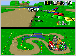 レース画面は上下に分かれています。下画面でレースの状況を確認しながら、上画面のカートを操作してください。 2人プレイの場合は、下画面が2Pの操作画面になります。 ![]() ※プレイするモードによっては、表示される項目が一部異なります。