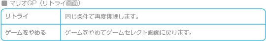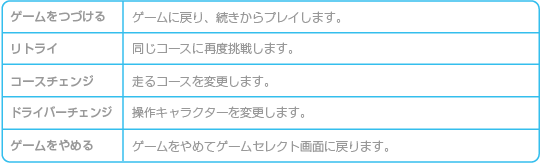 ※「コースチェンジ」「ドライバーチェンジ」は「マリオGP」では表示されません。 ※「リトライ」は「タイムアタック」でのみ表示されます。 |