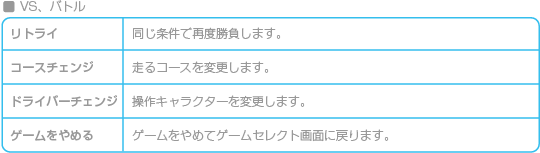「マリオGP」では、4位以内に入ると次のコースに進み、どれか1つのレースでも5位以下になるとリトライ画面が表示されます。 「VS」「バトル」「タイムアタック」ではレースが終わると結果画面とともに以下のメニューが表示されます。 ※「タイムアタック」では好タイムを出すとレース終了時に自動でデータが保存されます。 |