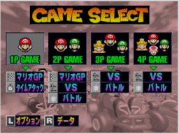 続いてプレイするモードを選んでください。 選べるモードはプレイ人数によって変わります。「マリオGP」または「VS」を選んだ場合はエンジン決定画面に、「バトル」または「タイムアタック」で「トライ」を選んだ場合はキャラクター選択画面に進みます。 |