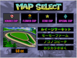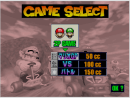 エンジンを決定します。「50cc」「100cc」「150cc」から選び、キャラクター選択に進んでください。なお、排気量が多くなるほどスピードが上がり、「マリオGP」ではコンピュータも強くなります。 |
