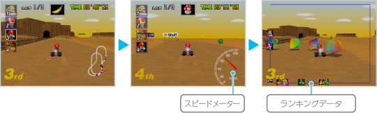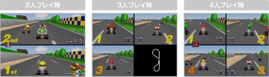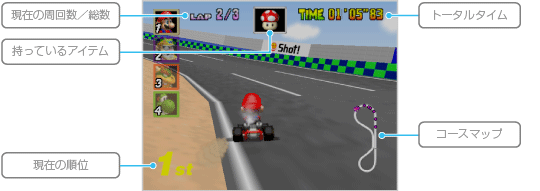 「マリオGP」「VS」「タイムアタック」では ※多人数プレイ時は表示の位置や種類が異なります。 |