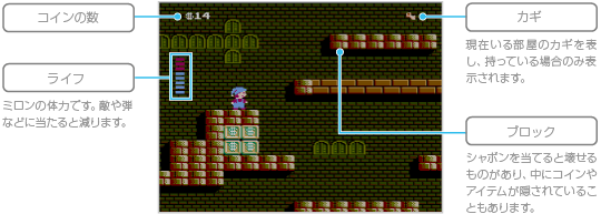 迷宮では、カギと出口の扉を探すことが第一の目的です。まずは敵を倒したりブロックを壊して、カギを出現させましょう。一方扉は迷宮内のどこかに隠されています。シャボンを当てると出現するので、あやしいところをシャボンで攻撃してみましょう。
