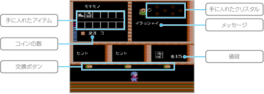 コインをアイテムと交換したり、ヒントを教えてもらうことができます。 ほしいアイテムや知りたいヒントの下についている交換ボタンをジャンプで押してください。 |