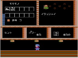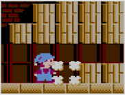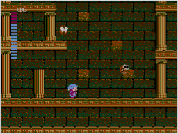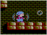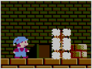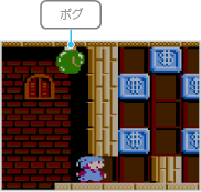 ミロンの半分ぐらいしかないすき間を通るには、アイテム「クスリ」を手に入れたあとにボグ(緑の敵)に触れる必要があります。ボグに触れるとミロンが小さくなり、今まで行けなかった場所に行けるようになります。 |