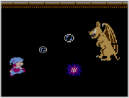 魔獣は強力な攻撃でミロンに襲いかかります。戦う前に「パラソル」を取ってシャボンの連射数を増やしたり、「ハチスケ」でバリアを張るなど、しっかりとした準備が必要です。なお、バリアがある状態でハチスケを取るか、バリアがあってなおかつライフが満タンのときに「ハート」を取ると、通常より耐久度の高いバリアになります。 |