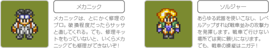 「ハンター」となった主人公は、冒険を進めるなかで「メカニック」と「ソルジャー」の2人を仲間に加えます。メカニックは修理のプロであり、戦車の修理に活躍します。ソルジャーは戦車に乗って戦うことは苦手ですが、あらゆる武器を使用できる肉弾戦のエキスパートです。 ![]() ![]() |