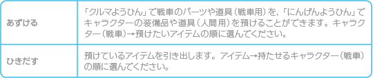 アイテムを預けたり、預けたアイテムを引き出したりできます。 |