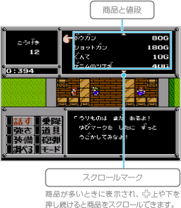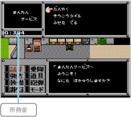 町には、お金を払って利用できるお店や、遠くの町にワープできる「転送センター」などがあります。 |