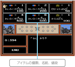 旅の商人がテントを張って商売をしている場合があります。ここでは、さまざまなアイテムの売買ができます。 |