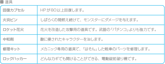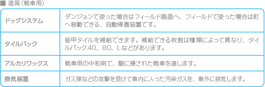 アイテムには、大きく分けて「人間用アイテム」と「戦車用アイテム」の2種類があります。