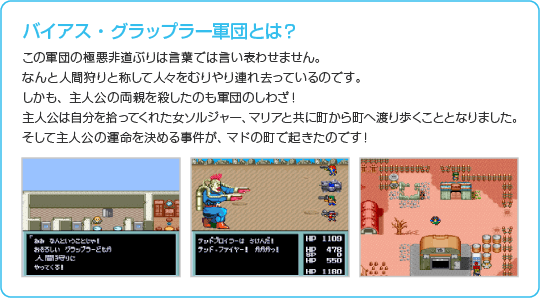 ひとりぼっちのモンスターハンター志願者さん 私は今、あなたがひとりぼっちになったときのことを考えてこの手紙を書いています。 私はソルジャー、戦うことが仕事だからヘマはしないけど、私の身になにかがあったら……。 もしそうなったとしても、今まで教えたことは忘れずにね。 とにかく生き抜くことよ。 そうそう、モンスターハンターはあなたのあこがれだったわね。 もしその気持ちが今も変わらないなら、ナイルおじいさんに会うといいわ。 マドの町で修理工場をやってるはずよ。 戦車の扱い方から修理まで、なんでも教えてくれるわ。 でもいきなりハンターになれるほど世の中、甘くないのよ。 まず自分自身を鍛えなければネ。 両親のかたき、バイアス・グラップラー軍団は憎いかもしれないけれど 冷静になって、少しずつ腕をみがくのよ。 マリアより |