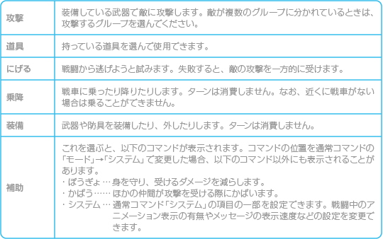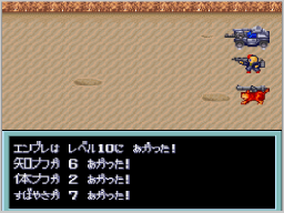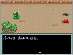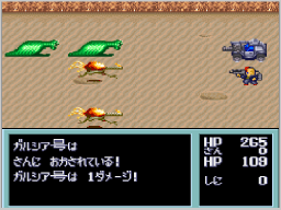 戦闘は、ターン制で進みます。「戦闘コマンド」からコマンドを選び、味方に指示を出して戦闘を進めてください。味方に指示を出し終わると、味方やモンスターなどの敵が行動し、全員の行動が終わると1ターン終了です。ふたたび戦闘コマンドで指示を出してください。 敵の攻撃でダメージを受けると、キャラクターの場合はHPが減り、戦車に乗っている場合はSPが減ります。敵か味方が全滅するか、逃げると戦闘が終わります。敵を全滅させた場合は、経験値(EXP)やゴールドが手に入ります。 ![]() |