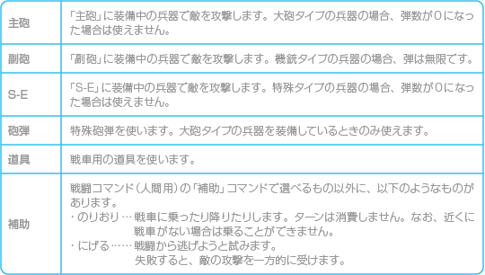 戦車に乗った状態で戦闘に入ると、戦車用の戦闘コマンドが表示されます。 |