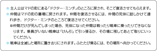 モンスターから特殊な攻撃を受けると、キャラクターや戦車が「マヒ」や「さん(酸)」などの状態異常になることがあります。状態異常になると、HPが少しずつ減っていくなど、プレイヤーにとって不利な状態が続くので、回復用のアイテムを使うなどして治してください。 |