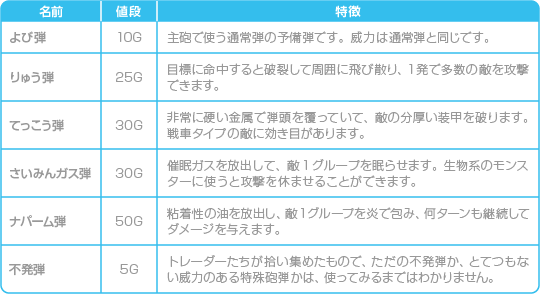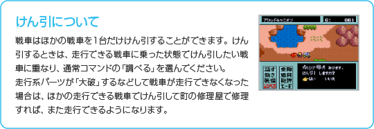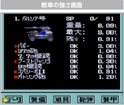 主人公は、冒険の途中で複数の戦車を手に入れることができます。 戦車を手に入れると、戦闘で有利になったり、戦車専用の便利なアイテムを使えるようになります。戦車はいくつかのパーツで構成されており、兵器などの装備品や戦車専用の道具を積むことができます。また、パーツを改造して戦車の性能をアップさせることもできます。 |