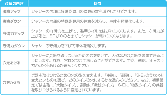 戦闘系パーツ(主砲、副砲、S-E)の攻撃力や守備力のアップ/ダウンや、弾倉を増やしたり減らしたりできます。 |