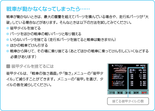 エンジンをパワーアップして、より重いものを積めるようにします。守備力のアップ/ダウンもできます。なお、改造すると重さと名前が変わることがあります。 |