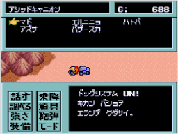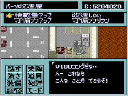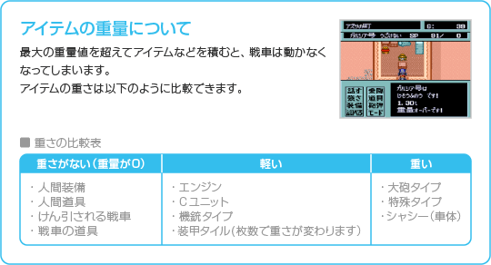 戦車用の道具「ドッグシステム」は、ダンジョンで使った場合はフィールド画面へ、フィールドで使った場合は行ったことのある町を選んで瞬間移動できる装置です。何回使ってもなくならず、戦車1台に積み込めばパーティ全員で移動できます。 |