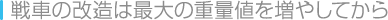 | 戦車の改造を行うときは、まず戦車の最大重量を確認してください。最大重量を超えると戦車が動かなくなってしまうので、先にエンジンの性能(最大重量)をアップさせてからほかのパーツを改造します。 エンジンの性能を無視して改造を行うと、装甲タイルを貼れる枚数が減ったり、強力な戦闘系パーツを積むことができなくなったりして、総合的な戦闘力が落ちることもあります。 |